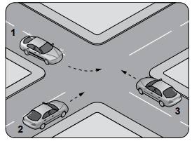 36. Şekildeki kontrolsüz kavşakta karşılaşan araçların geçiş hakkı sıralaması nasıl olmalıdır?