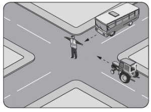 30. Şekildeki trafik görevlisinin işaretine göre aşağıdakilerden hangisi doğrudur?