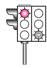 35. Şekildeki ışıklı trafik işaret cihazında, kırmızı ışık ve yeşil oklu ışık birlikte yanmaktadır.