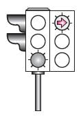 46. Şekildeki ışıklı trafik işaret cihazında, yeşil ışık ve kırmızı oklu ışık birlikte yanmaktadır. Bu durumda sürücülerin aşağıdakilerden hangisini yapması yanlıştır?