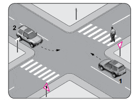 13. Şekildeki kavşakta sola dönüş yapacak olan 2 numaralı araç sürücüsü nasıl davranmalıdır?