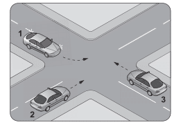 4. Şekildeki gibi kontrolsüz kavşakta karşılaşan araçların geçiş hakkı sıralaması nasıl olmalıdır?