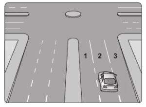 30. Şekildeki aracın sürücüsü, dönel kavşaktan geriye dönüş yapmak için hangi şeridi izlemelidir?