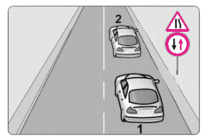21. Şekildeki trafik işaretlerine göre 1 numaralı araç sürücü nasıl davranmalıdır?