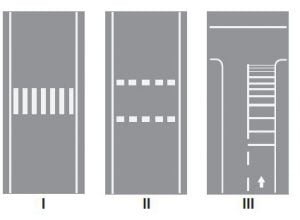 50. Taşıt yolları üzerine çizilen şekildeki yatay işaretlemelerden hangileri yaya geçidini gösterir?