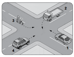 40. Şekildeki kontrolsüz kavşakta ilk geçiş hakkını hangi numaralı araç kullanmalıdır?