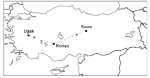 4. Sivas’tan hareket eden bir araç, haritada görüldüğü gibi önce Konya’ya oradan da Uşak’a gitmiştir.