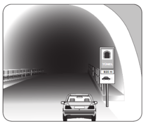 12. Şekildeki gibi yeterince aydınlatılmamış tünele giriş yapan aracın sürücüsü aşağıdakilerden hangisini yapmak zorundadır?