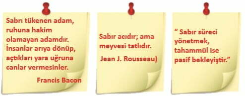 “Yalnız basit şeyleri tam ve mükemmel yapmaya sabırları olan insanlar, güç şeyleri kolaylıkla öğrenme becerisini kazanabilirler.” (Friedrich Schiller) Gücünü sabrından alan kişiler hep kazanan kişilerdir. “Sabrınız gücünüzden daha çok şey başarır.” (Edmund Burke) ifadesi ile bu duruma işaret edilmiştir. Sabır, zorluklara karşı bir direnç, sıkıntılarda metanetini yitirmeme duygusudur.