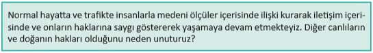 Trafik kuralları ile birey olarak bizlerin ve diğer insanların hakları ve yükümlülükleri belirlenmektedir. İşte bu belirlenen kurallara uyulmadığında yayalar, sürücüler ve bisikletliler diğer insanların haklarını ihlal etmiş olurlar. Bu nedenle trafikte düzenin sağlanması trafikte bulunan diğer insanların hakkını gasp etmemek için trafik kurallarına uyulmalıdır. Diğer bir deyişle trafik kuralları bireyleri hem kendisine hem de başkalarına karşı korumaktadır. Dinimizde de tehlike oluşturmak günah, tehlikeyi savuşturmak sorumluluktur anlayışı benimsenmektedir. “Kim bir canı kasten öldürürse bütün insanları öldürmüş gibidir. Kim de onu yaşatırsa bütün insanları yaşatmış gibi olur.” İlahi fermanı doğrultusunda insanlara karşı görevlerimizi yerine getirerek gerek trafikte gerekse diğer zamanlarda kimseye zarar vermememiz gerekir.